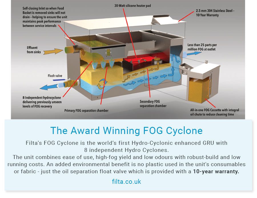 Filta Group are delighted to have been awarded Winner of the Catering Insight Dealers Choice Awards (pg.24) in the category of Grease Management. The award is for the FOG Cyclone – Filta’s next-generation Grease Removal Unit (GRU).